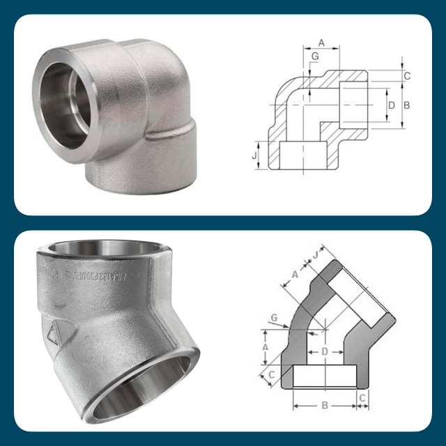 ASME B16.11锻制承插弯头,尺寸范围从 1/8 英寸至 4 英寸,无论是精密仪器设备,还是普通工业生产管道,都能找到适配的管件尺寸,为管道系统的设计与搭建提供了极大便利。按压力等级分 Class 3000、6000、9000 ;按弯曲角度可分为 45度承插弯头和90承插弯头。