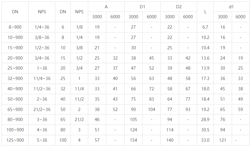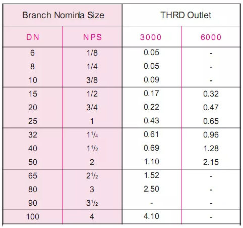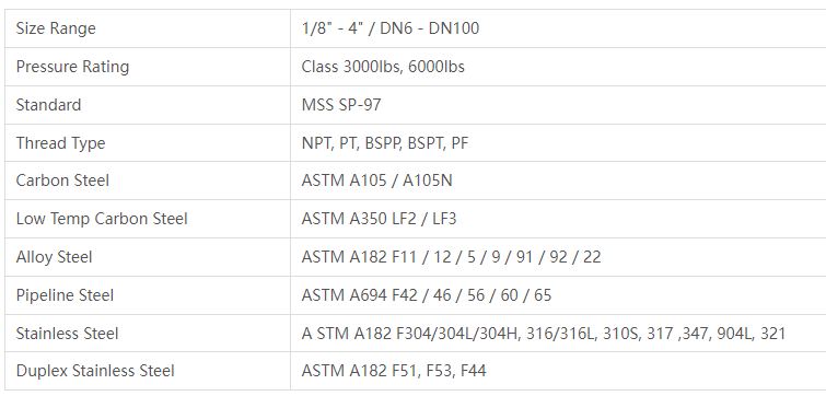 常规的螺纹支管座尺寸范围在1/8英寸到4英寸之间,;常见的压力等级包括3000LBS (SCH XS)和6000LBS(160)。原材料包括碳钢,不锈钢,合金钢,低温钢等多种材质。