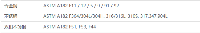 ASTM A182材料标准包含了合金材质,不锈钢材质和双相不锈钢等多种等级材质,其中比较常见的材料整理在下列表格中。