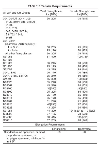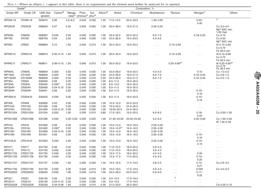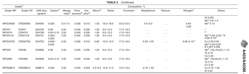 ASTM A403规范是关于奥氏体不锈钢材质的标准,它包括多种牌号如304、316、316L等。ASTM A403规范中规定了不锈钢对焊管件制造、检验和试验要求。根据管件的材料类型、尺寸和压力等级进行分类和命名,以表明其适用范围。此外,规范还规定了不同牌号不锈钢的化学成分、机械性能、热处理、表面处理等方面的要求。