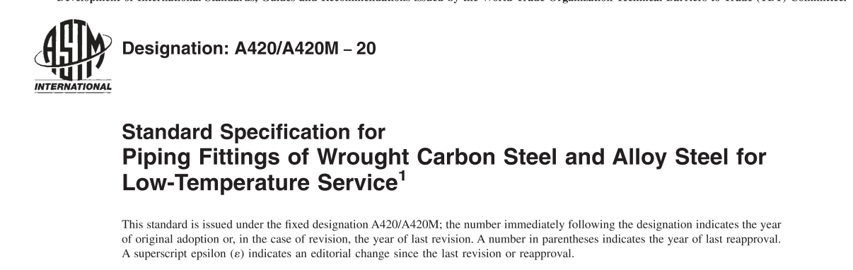 ASTM A420标准是美国材料与试验协会(ASTM)发布的一种标准,用于规范低温用碳钢和低合金钢管件在低温环境下的制造、检验和使用的技术要求。该标准适用于无缝和焊接结构的对焊管件,主要包括对焊弯头,对焊三通,对焊异径管,对焊管帽等多种用于低温压力管道和压力容器的管件。