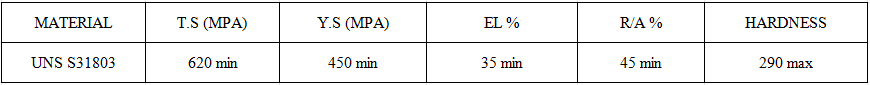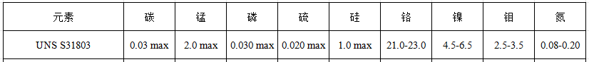 UNS S31803由大约40-50%的铁素体组成,这种双相微观结构提供了铁素体等级的高强度,同时保留了奥氏体等级的耐腐蚀性。这种不锈钢对于氯化物引起的应力开裂有很好的抵抗能力,且对海水和大多数浓度的硫酸具有出色的耐腐蚀性。此外,它还耐硫化物应力腐蚀开裂。